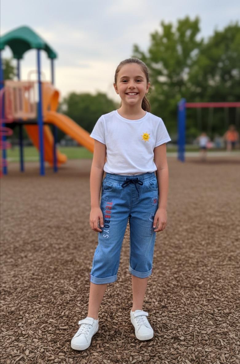 - Material: Likely a soft, lightweight cotton-blend denim, often used for children's activewear.