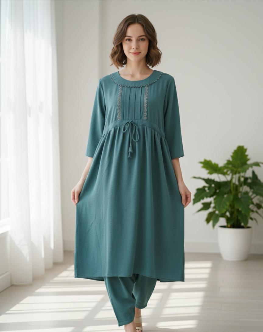 The tunic top presents a timeless round neckline with three-quarter sleeves and a flattering silhouette that drapes beautifully on all body types. Its relaxed yet stylish design pairs flawlessly with the straight-cut pants, creating a cohesive and sophisticated look that’s easy to wear throughout the day.