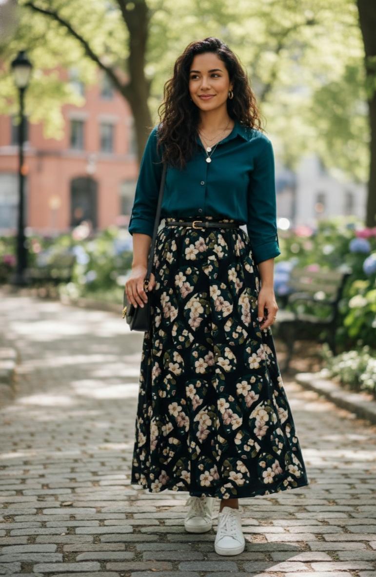 - The Skirt: The centrepiece of the outfit is a high-waisted floral maxi skirt. It features a black background with large, cream-coloured floral prints. The cut is an A-line silhouette, which offers movement and comfort.